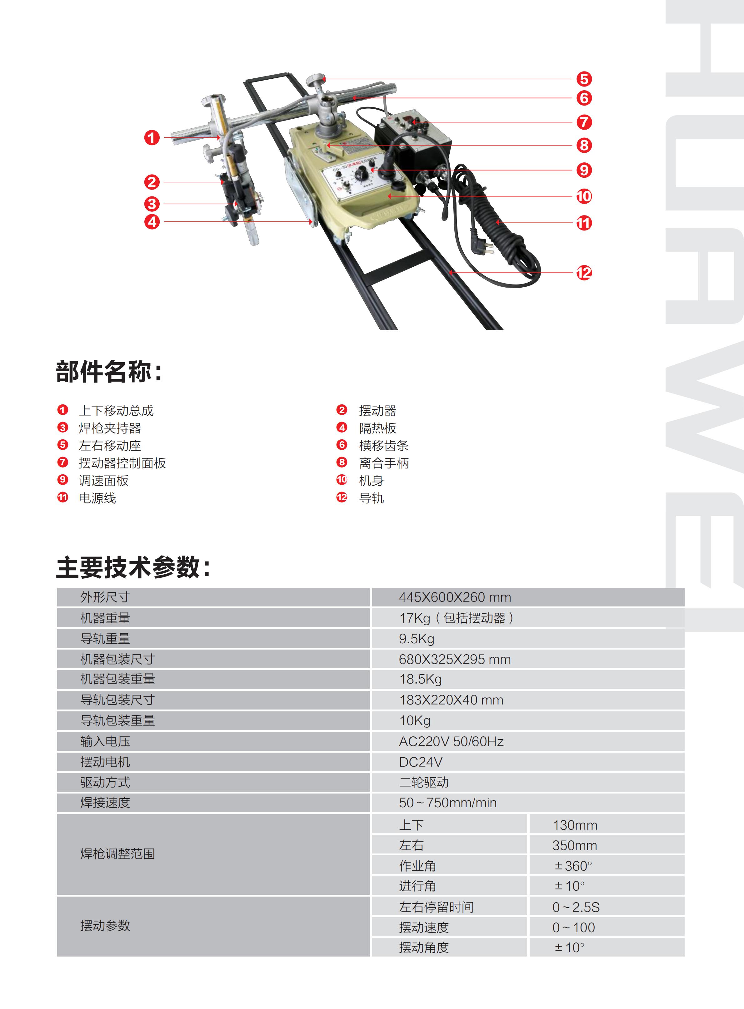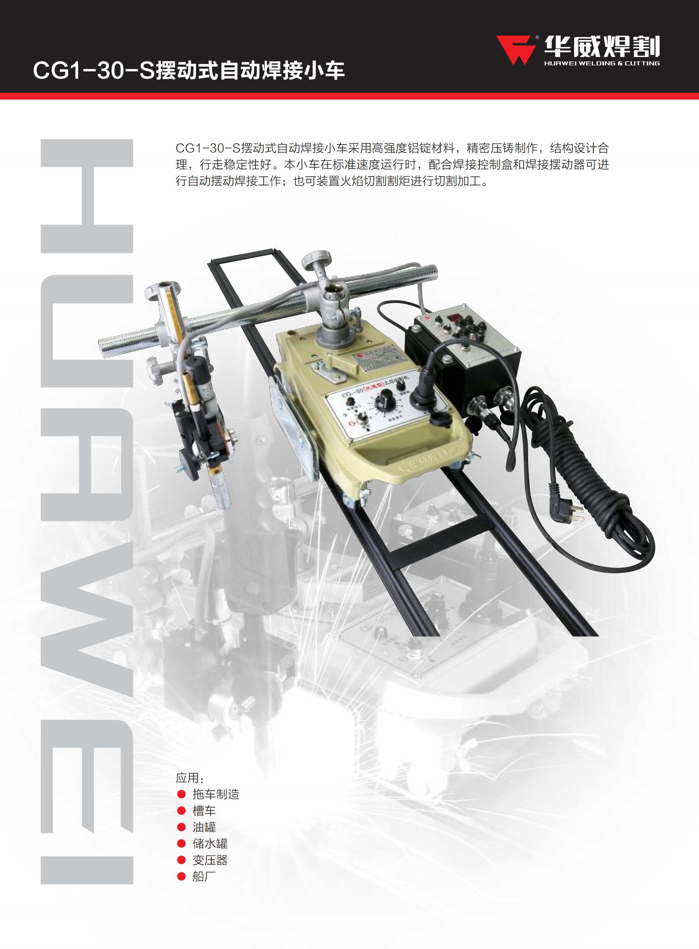 CG1-30-S擺動式自動焊接小車采用高強度鋁錠材料,精密壓鑄制作,結構設計合理,行走穩定性好。本小車在標準速度運行時,配合焊接控制盒和焊接擺動器可進行自動擺動焊接工作;也可裝置火焰切割割炬進行切割加工。