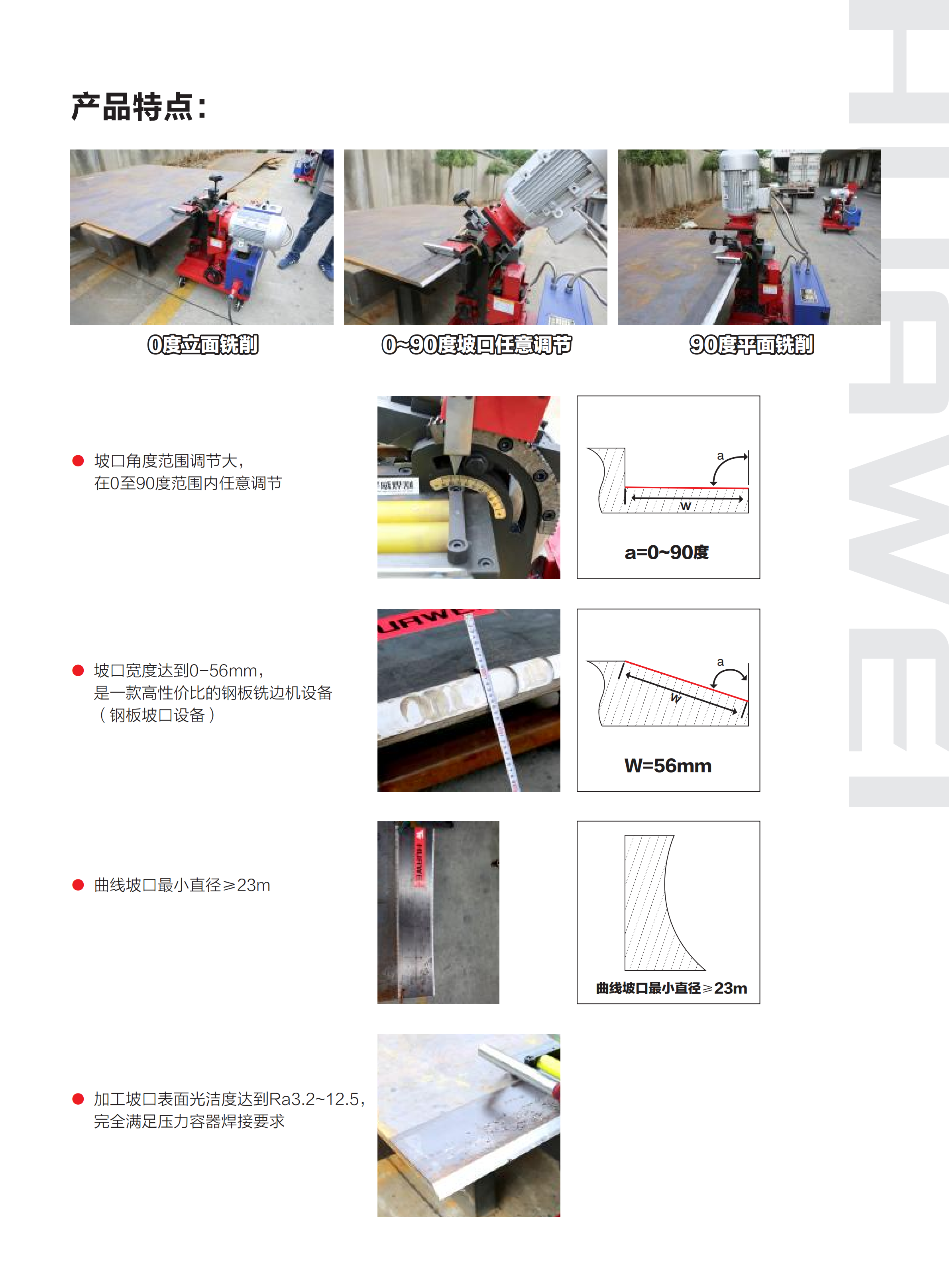 本產(chǎn)品是一款自動(dòng)行進(jìn)式銑邊設(shè)備,加工坡口過程中自動(dòng)行進(jìn)銑削,降低使用成本,減輕勞動(dòng)強(qiáng)度,采用冷切削作業(yè),加工后的坡口表面無氧化。坡口表面光潔度Ra3.2~6.3.完全符合焊接行業(yè)要求,無需去毛刺處理可以立即焊接使用,本品無污染,操作更加簡(jiǎn)單。