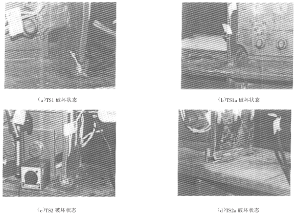 試驗時,首先沿使梁的上翼緣受拉的方向施加水平荷載, 然后反復加載。試件 TSl 由于平面外約束不足,在彈性加載階段就出現了扭轉, 節(jié)點板域有輕微屈服發(fā)生。塑性階段,焊接孔末端梁腹板與翼緣相接處上翼緣被腹板抵壓開裂。剪切板出現滑移, 破壞時下翼緣幾乎全部裂開, 加載點平面外位移約 5cm。TSla 在塑性階段,腹板受壓側觀察到局部屈曲,梁端加載點平面外位移最大達7cm, 剪切板附加焊縫受拉側明顯開裂。最后受拉側翼緣焊縫突然破壞, 荷載迅速下降, 梁下翼緣部分拉斷,同時上翼緣被壓屈。