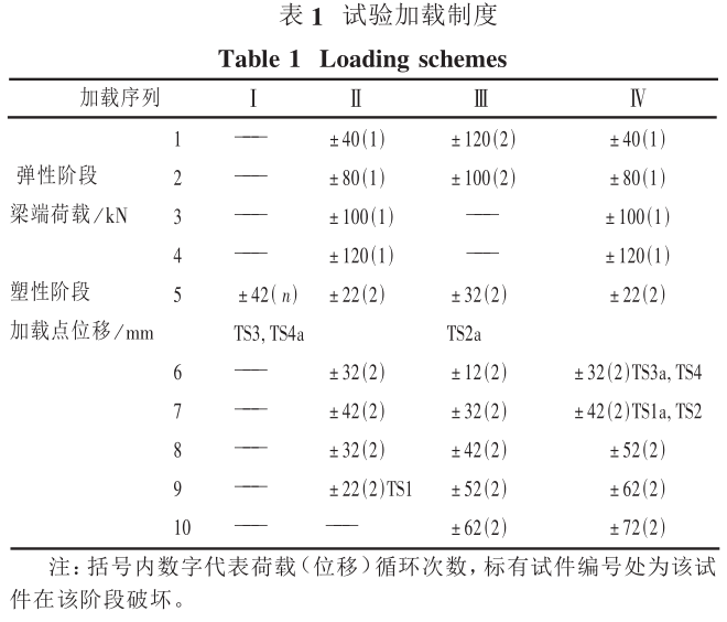 根據有限元分析,試件的彈性極限荷載約為120kN。加載分兩個階段,彈性階段最大荷載為120kN, 采用荷載增量控制, 出現塑性屈服后采用位移增量控制。為了研究加載次序對試件承載性能的影響, 試驗過程中采用了 4 種不同加載序列 (表 1 ) 。 其中加載序列 I 為直接在 42mm 位移幅度下加載至試件破壞。 試件 TS3 和 TS4a 采用加載序列 I, TS1 采用加載序列 II, TS2a 采用加載序列 III, TS1a、 TS2、 TS3a 和 TS4采用加載序列 IV。實際上在試驗中, 當梁端水平荷載加至 120kN 時已經觀察到局部漆皮起皺,即已發(fā)生局部的材料屈服。