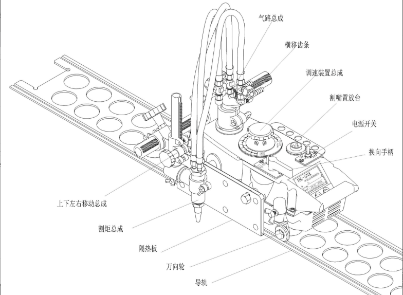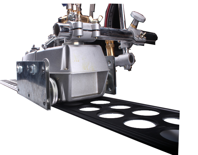 HK-5NX 切割機采用高強度鋁合錠材料,精密壓鑄制作,結構設計合理,行走穩定性好。本裝置調速系統采用機械式降噪保護無級變速系統調速,易于操作與維護。本裝置采用機械換向系統取代電子開關,電機單方向運轉,不需要頻繁正反轉,延長電機使用壽命。本裝置割炬一側裝有雙層隔熱板,有效防止機身升溫,減少了切割時高溫和潮濕環境的影響。本機采用交流電機,自帶冷卻風扇,無須更換碳刷。根據用戶需要可同時安裝兩把割炬,進行坡口切割;用戶也可選購圓盤導軌和半徑桿進行圓形零部件切割。本裝置適用于造船、石油化工、橋梁建設及金屬鋼結構等工廠。