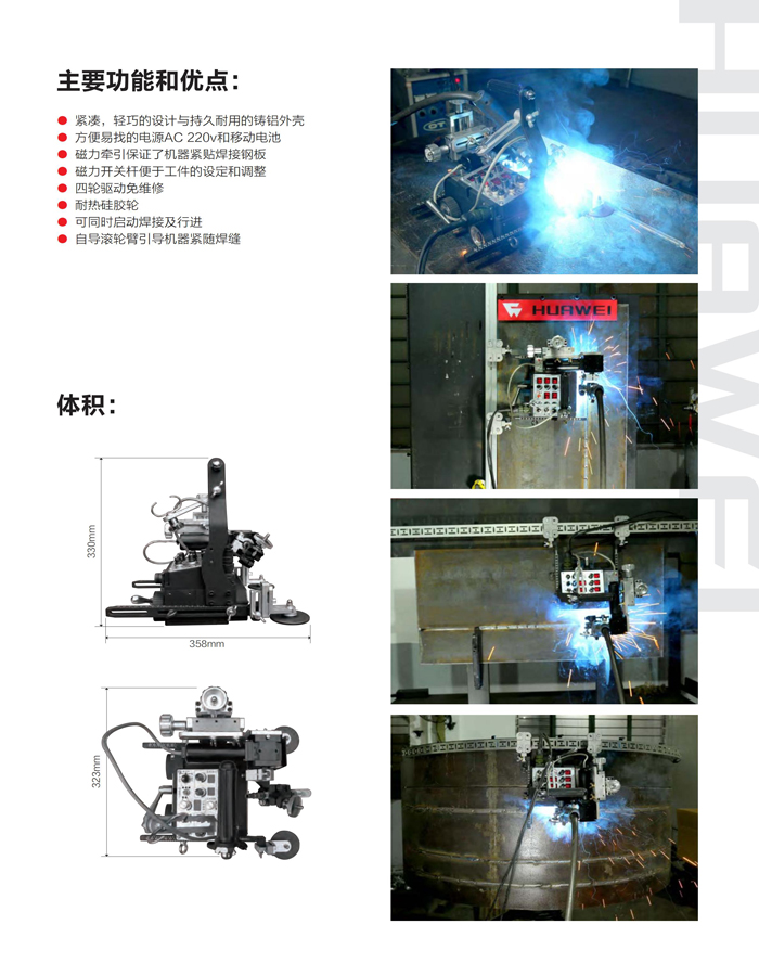 減少勞動強度,改善作業環境。提高工作效率,是手工焊的1.5倍。避免人為因素所造成的焊縫質量不良,一般的手工操作的不良率在20%左右,而采用自動焊接小車沒有產生焊接不良率, 因此其綜合效益,比手工焊提高近200%。自動化程度高,確保焊接質量的穩定性。非熟練的技術工人也能快速掌握:HK-7W-F全位置擺動式自動焊接小車是在標準角焊機的基礎上,為獲得較大的焊縫尺寸并且一次成型而開發出來的帶擺動器的焊接小車。它兼有標準角焊機簡單輕便的特點,又能進一步提高焊接效率。