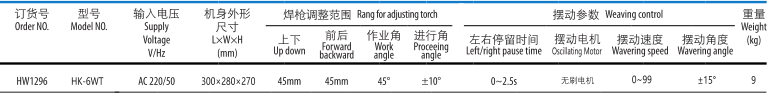 HK-6WT 擺動焊角焊小車一體化機(jī)身,堅(jiān)固耐用,輕巧便攜。低重心設(shè)計(jì),小車具有16kg拖力,能夠穩(wěn)定爬行。設(shè)有磁控手柄,移動手柄時(shí)可以減少部分磁吸力。容易安裝。可以左右兩方向焊接,小車兩端均安裝有感應(yīng)開關(guān),焊接結(jié)束后小車可以自動停止。具有收弧功能,提高收弧處的焊縫質(zhì)量。該機(jī)具有擺動功能,有不同規(guī)格的焊道方式可供選擇。擺動幅度,擺動角度,中心偏移位置和左右停留時(shí)間, 均可數(shù)字輸入。數(shù)碼管顯示各種調(diào)整數(shù)據(jù),大大縮短設(shè)置時(shí)間。 擺動模式可供選擇。